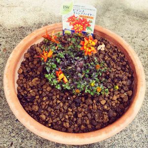 お疲れ様です( ˶ˆᴗˆ˶ ) 昨夜遅くからの暴風も落ち着いているようです*˘◡˘*ホッ💜 ウインターコスモスで少し高さのある寄せ植え✿*:・゚真上から✿*:・゚ キンギョソウ…何色だったかな 咲くまで時間がかかります^^;