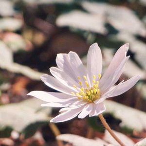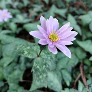 ユキワリイチゲ このところの陽気に、ようやく春の妖精のお出ましである(๓´˘`๓)♡ 他のイチリンソウ属に見られるように、紫色を帯びた花弁のように見えるものは萼で葯は黄色、花茎の先端にひとつだけ花を咲かせる♬ 林の縁の群落は根茎が繋がっていて、遺伝子が同じ物同士は結実しないが、いつか実も見たいものだ‥‥