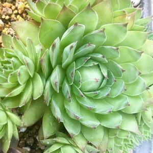 記録用、真上からです。 可愛い〜😍 手前の3個並んでいるのかコサニーニ。 右の大きいものと、上の小さいの、コサニーニの上にあるもの、の3株がハートです。 今回調べて知った内容として… センペルビウムはベンケイソウ科センペルビウム属の春秋型種。 属名はラテン語の「semper」(常に)と「vivum」(生きています)が由来。 高山性の多肉植物なので耐寒性に富んでいる。 もっと増えたら地植えにもチャレンジしてみたいです💕