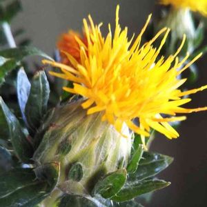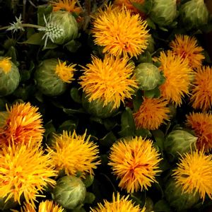 紅花💛🧡❤️はキク科の1年草🧡 アザミに似た花が咲きます💜 咲き始めは鮮やか黄色💛次第に色が濃くなり、赤❤️くなります。 花弁からは染料や口紅💄の元になる❤️色素が取れますし、種からは、紅花サラダオイルが取れます。