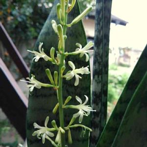 今日の朝はひんやりとしています😃 観葉植物を夏は全部ベランダに置いたら、その環境が良いらしくて元気に育っています😄✌️ サンスベリアのお花まで咲いてくれて感激‼️🎵💓😄😆👏😍