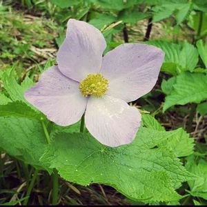 白根葵 シラネアオイ科 5月〜6月 1花1属1種の日本特産種。 湿気の残る雪解け後の斜面によく見られる。花に見えるのはガクであり、花弁はなく、黄色い雄しべが多数ある。