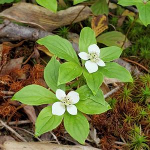 御前橘 ミズキ科ミズキ属 6月〜7月 4〜6枚の輪生状の葉にひし形状の白い花…に見える。しかし、白い花弁に見えるのは4個の総ホウ片で、花は中心にある部分。 葉は茎先に6枚が輪生状につきますが、花がつかない茎では4枚となる。 秋に赤い実がつく。