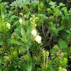 青の栂桜 ツツジ科 7月〜8月 雪田周辺に咲く。花冠は淡い黄緑色で、長さ6-7mmの壷型になり、すぼまった先端が浅く5裂する。花は下向きだが、実は上を向く。