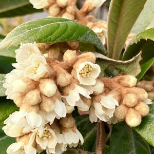 フッキソウ 花期は早春、早くても年が明けてから咲くのだろうなぁと、ご近所の植栽を眺めていると、おや?もう雄しべが顔を覗かせているものが♬ 花弁のない雄花は、シメジの白い軸のような太い花糸、その先には紫褐色の葯🟣 学名はギリシャ語で太い雄しべという意味だという(๑´∀`๑) 蕾の塊の下に見える細長い蕾は雌花かな💚 白玉のような実に突き出る2本のツノは、雌しべの花柱の名残りだという👹 まだまだ固い 金曜日の蕾たち🏷