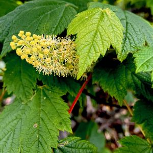 オガラバナ(麻幹花) 別名 ホザキカエデ *ムクロジ科カエデ属 花期は6〜8月 北海道〜中部地方以北(四国)の山地.亜高山帯の林縁に生育する、落葉小高木! 葉は葉柄があり対生し掌状に5〜7裂! 葉柄が赤みを帯びるのも特徴! 基部は浅い心形〜切形! 花は枝先に直立した円柱状の花序で黄緑色の小さな花を多数! タイミングよく開花に出会えました❣️ 🏷️木曜日は木 6月30日撮影