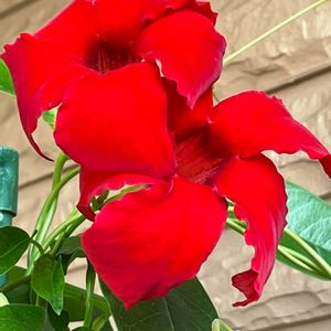 こんにちは😃 つるの、先端で咲いているお花 今は、🌺が、おやすみで この🌺だけ、きれいに咲いて います😊 赤色が、玄関先で、目立ちました😊 台風の被害が、少ない事を祈ります。 まだ、続きそうですが、気を付けて下さいね。