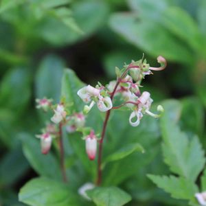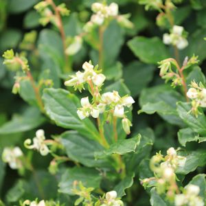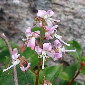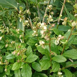 深山穂躑躅 ツツジ科ホツツジ属 7月〜8月 亜高山の林縁や高山の岩場などに自生する。葉は枝に互生し、葉の形は倒卵形で長さ1-5cm、先端はまるく、縁は全縁。 枝先に総状にまばらに花序をだす。花弁の色はやや赤みを帯びた緑白色で、3枚が反り返って丸まる。雌しべが弓状に象の鼻のように曲がるのが特徴。ホツツジ属のホツツジは雌しべは、長くほぼまっすぐに伸びる。