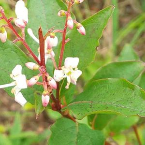 深山穂躑躅 ツツジ科ホツツジ属 7月〜8月 亜高山の林縁や高山の岩場などに自生する。葉は枝に互生し、葉の形は倒卵形。花弁の色はやや赤みを帯びた緑白色で、3枚が反り返って丸まる。雌しべが弓状に象の鼻のように曲がるのが特徴。 ホツツジとの見分け方は、雌しべの先が上に丸まるのがミヤマホツツジで、 ホツツジ の雌しべはまっすぐ。