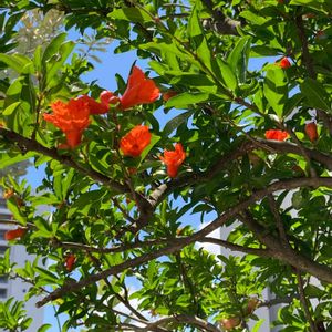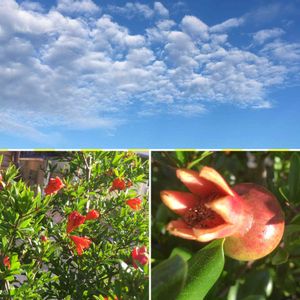 散歩中🚶♀️🚶♂️ 空とザクロの花🌼と実🥭 今日も暑くなりそうですね^_^ 頑張って👍