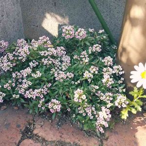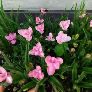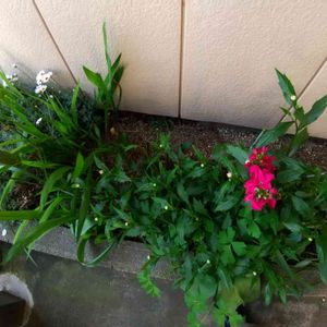 カーポート屋根下になり☀️が届かない😥😥赤はストック🌼ミヤコワスレに小さな蕾、見えない位😂😂🤗