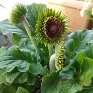 ガーベラ🌼 一本だけ咲いてた値下げのポットを買い、ずぅ~っと咲い続けとうとう✂️ 😅 4つの新しい蕾が🌱🎶