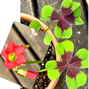 これがラッキークローバー ハートの四つ葉とお花の両方が出てきましたよ〜 かなりシッカリした球根でした ダイソー100均で、こんなに楽しめるとは思わなかった❣️ あれっ? これ毎年出てくるのかな? クローバーはマメ科で葉っぱは丸型 オキザリスはカタバミ科で葉っぱはハート型 このラッキークローバーは、オキザリスの仲間で、クローバーでは無いそうです