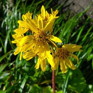 トウゲブキも、海岸近くの草原に咲き始めていました🌼🎶 キク科 メタカラコウ属 別名、エゾタカラコウ(蝦夷宝香)、オニタカラコウ(鬼宝香) 日本では、北海道、本州の福島県・山形県以北に分布し、山地帯から亜高山帯の開けた草地に生育する。 世界では、千島、樺太に分布する。 頭花は房状にならず茎の先端に接してつく。 その点,マルバダケブキに似ているが本種の方がより小型。 マルバダケブキは本州中部に多いが,東北から北では置き換わるようにトウゲブキを見ることが多い。 ツワブキ属のツワブキも似ているが,葉に光沢があり暖地の海岸に生える点が違う。