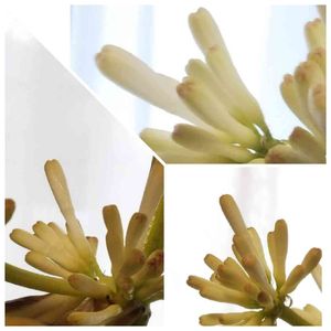おはよーございます 幸福の木の経過報告です 蕾を発見して3週間近く 20㌢くらいまで茎が伸び 5つの花のかたまりができてます🤩 花が開くまでは 後 10日くらいかな🤔