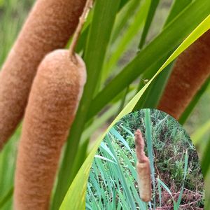 今日のお花❀.*・゚ *ガマ 今朝、早朝散歩、まだ1本だけ穂が出ていただけでした(8・13日撮 右下) 背景は昨年9月中旬撮