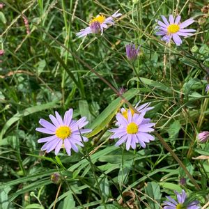 おはようございます😃 ヨメナの花は夏から咲くようなので、 田んぼの畔道を探して歩きました。 ずいぶんと、歩きました。 やっと見つけました。 数年前から、野菊の仲間にいくつも出会いました。 しかし、調べても名前が確認できませんでした。 今年こそ、ヨメナとノコンギクの区別だけは確認したいと思っていました。🤔 一昨日に投稿した、葉っぱだけの草は正直なところ、ヨメナかノコンギクか分かりません。 水辺だったのと、葉っぱが柔らかかったので、ヨメナと付けました。 ここの花は判断基準によく書かれている、 花びらの付け根の冠毛の長さを調べてみました。 花を摘んで、何枚か、花びらを抜いて見ました。 ほとんど、毛らしいものは見えません。 これはヨメナでいいと思われます。😁 葉っぱを触っても、ザラザラした感じはなくすべすべです。 ヨメナは多年草です。 毎年同じ場所で見られると思います。 しかし、田んぼの畔は泥壁にされたり、除草剤が撒かれたりするせいでしょう。 なかなか見つかりません。🤣 散歩途中に、他にも似た草があります。 花が咲いたら、冠毛を調べてみるつもりです。 街中で見られるものはノコンギクではないかと思っています。 まだ咲いていません。🤔 野菊と呼ばれる野生の花が好きですが、ヨメナの仲間はたくさん名前があります。 関東ヨメナとか、朝鮮ヨメナとか。 とりあえず、ノコンギクでなかったら、ヨメナでいいことにします。😅