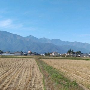 番外編 今日の常念岳 田んぼのあぜ道、 緑をたどった先の 尖った山が常念岳。 2022.10.21.午後