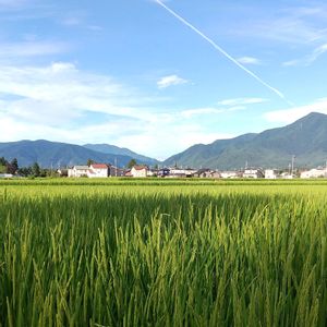 番外編 穂を一気に付けた稲、その先に飛行機雲。 今朝の一風景。 2023.8.3.朝