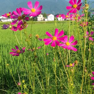 コスモス キク科コスモス属 遠くに常念岳、まだまだ夏山の様相。 2023.8.12.早朝