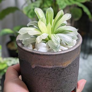 新しく買った方のピリフェラ錦植え替えました。 鉢はセリアの小さいストーン調ポットです。