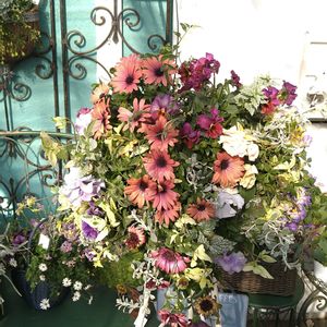 3回目のギャザリングレッスン。自由課題でまずは作成。メインでカリブラコアを使うつもりが、日々草の入荷があり、ピュアホワイトのカラーに惹かれて変更。しかし植えているうちに花びらを落としてしまうこの悲しさよ涙。 お次の課題はリースです。同じような大きさでユニットを作るのがコツと教えてもらいました。が、得意不得意あり技術がいるとのこと💦とりあえずDyiしたプランターにかけてみましたな大きすぎましたw 寄せ植えに植えているペチュニアはようやっと先揃ってきました。と思ったら梅雨に入りそうですね。 今年お迎えしたクレマチスは、控えめにグリーンが入るところが気に入っています。充実するのに3-4年かかるとのことで、花数も控えめです。 最後はずーーっと待機させてしまつていたミニバラ。タグにはサンセットコルダナと書いてありました。どう見てもその色ではない。昨年ミニダリア苗をうえましたが、購入時以外ついぞ咲くことはなく、待ちくたびれたので、メインをこれに変えました。待機中に5つの花のうち、3つは飛んでしまいました…リーフもいろんな鉢から使い回しです。時間が経って馴染みますように。