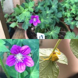 ゲンノショウコ咲きました✨ 薬草系は半日陰~日陰が多いので、車のミッション積んできた木パレットをバラして鉢棚作りました。色塗んなきゃな。錆びちゃうしね。 ゲンノショウコ(げんのしようこ) 学名: Geranium thunbergii 民間薬草 利用部: 地上部 効能: 整腸、止瀉 面白い蜘蛛いた。花蜘蛛の一種