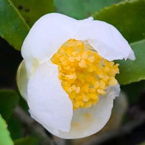 チャノキ 茶の花の花粉⁈が雨に弱いそうで、花が下向きに咲くらしいです。 青い空×白い茶の花が好きなんです。