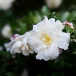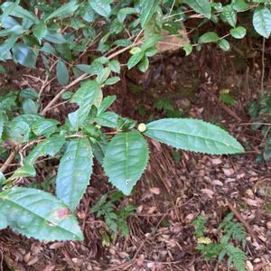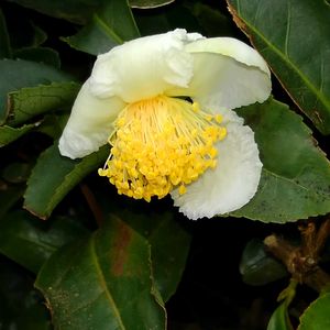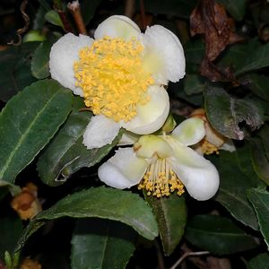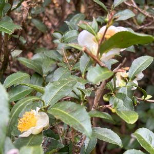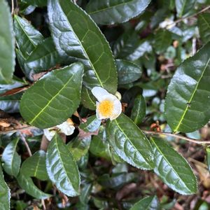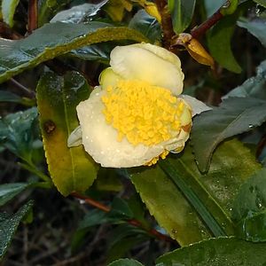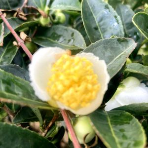 雨上がりです♪ チャノキ(茶の木) ツバキ科 ツバキ属 常緑低木 帰化植物 中国、台湾原産 奈良時代に、中国から薬用として渡来。 鎌倉時代から茶の栽培が始まったといわれる。 葉は互生、楕円形で縁には細かい鋸歯。 花は直径2〜3cmの白花。花弁は5〜7個でほぼ円形。雄しべは多数、基部で合着する。花柱は先端が3裂。 果実は3角形に近い円形。果皮は3裂する。 花期10〜11月 11月9日撮影 高尾山