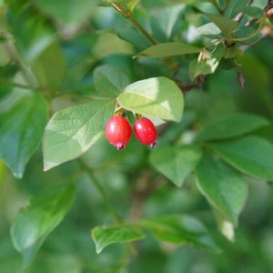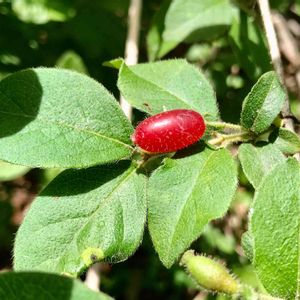 いつの間にか赤い実がたくさん❣️ 一つ食べてみたら、ほんのり甘い味😊 種と水分多めの実です。 ✨✨✨ 【ミヤマウグイスカグラ(深山鶯神楽)】 Lonicera gracilipes glandulosa スイカズラ科の落葉低木 夏にできる実は食べられる