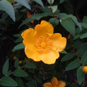 タイリンキンシバイ Hypericum × hidcoteense Geerinck 雨に濡れた雄しべが少しずつ束にまとまっている 水滴の水曜日🏷 花弁はしっかりと開いて、縁に切れ込みが入る🧡キンシバイはこんなに開かずすぼまったカップ状の咲き方をする♬ セイヨウキンシバイやビヨウヤナギと違って雄しべは花弁より短いので、初めから雌しべの柱頭が5つに割れているのがよくわかる💛 蕾は卵型で葉は斜め十字対生💚花が終われば子房は膨らむけれど、コボウズオトギリのような赤い大きな実にはならない◉ そういえば、キンシバイの園芸品種と言われたこともあったけれど、実は親ではなく、他の3種間雑種らしい ヒペリカムご一族🏷🔼