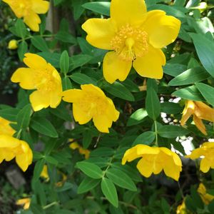 おはようございます♪ ヒペリカムの仲間 オトギリソウ科 ①中央 小坊主弟切(コボウズオトギリ)ヒペリカム・アンドロサエマム 茎は直立し花は1.5〜2cm程でカップ状に咲く、🍃葉は対生 ②西洋金糸梅(セイヨウキンシバイ) ヒペリカム・カリシナム 花は(5〜6cm)広角に開き雄しべが花弁より長く葯が赤色で🍃葉は対生 ③美容柳・未央柳(ビヨウヤナギ) ヒペリカム・モノギナム 花は5cm程で、雄しべは花弁より長く葯が黄色 🍃葉は十字対生 ④金糸梅(キンシバイ) ヒペリカム・パツラム 枝垂れた枝先にうつむきかげんに小さな花(2〜3cm)を咲かせます 🍃葉は2列対生 ⑤大輪金糸梅(タイリンキンシバイ) ヒペリカム・ヒドコート 花は大きく(5〜6cm)花弁先に浅い切れ込みがあり、🍃葉は対生〜十字対生 金糸梅の園芸品種