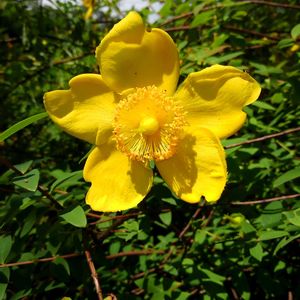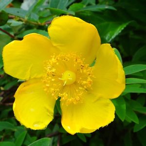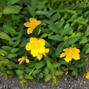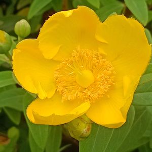 おはようございます♪ 今日も雨☔模様です 散歩道のお花 🐕🐾 💛大輪金糸梅(タイリンキンシバイ)💛 別名ヒペリカム・ヒドコート オトギリソウ科オトギリソウ属 半落葉低木 開花期6〜7月 雌雄同株 花は大きく(5〜6cm)花弁の先に切れ込みがあります 枝はしばしば赤みを帯び葉は対生〜十字対生です 金糸梅の園芸品種でセイヨウキンシバイを片親とする交雑で、最近はキンシバイより多く見かけます