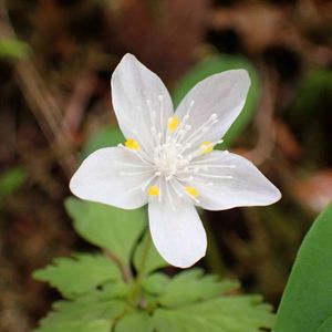 ツルシロカネソウ(キンポウゲ科シロカネソウ属) 林の中に群生してました。 別名 シロカネソウ。 山地の林下や沢沿いなどに生える多年草で、草丈10~20センチ。匐枝を伸ばして繁殖する。茎葉は対生し、頂小葉は菱形卵状で鈍い欠刻がある。 花は白色で5裂し、外側にしばしば紫色の条がある。花期は4~6月。神奈川県~奈良県の太平洋側に分布する。 根茎が横に長く這って増えていくことから和名の蔓白金草の名前がついている。