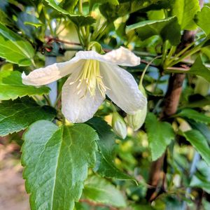トリガタハンショウヅル(鳥形半鐘蔓)キンポウゲ科センニンソウ属 別名 アズマハンショウヅル 昨年咲いてた場所に今年もたくさんお花を付けてました。 ライムグリーンのベル型のお花が可愛いです。 葉は1回3出複葉、小葉は2-9cmの卵形~卵状披針形、粗い鋸歯があります。 花はその年に伸びた短枝の葉腋に単生し、鐘形で長さ1.5-3cm、下向きに咲きます。花弁に見える萼は4、黄色みを帯びた白色、外面にはふつう、白毛が多く見られます。