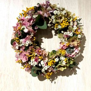 春っぽい明るいリースを、とのオーダーでした。 ピンクのアンティークアジサイで桜をイメージ、そしてミモザで春の明るさを。