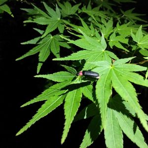 ホタル✨です。 わかります?真ん中あたりに 光ってるお尻がわかるでしょうか 頭は、右の方にあり、 葉の裏側に逆さまに しがみついているんですけど… 今年は、梅雨入りが早くて ホタルたちも焦ってますよね。 お相手見つかるといいです❣️