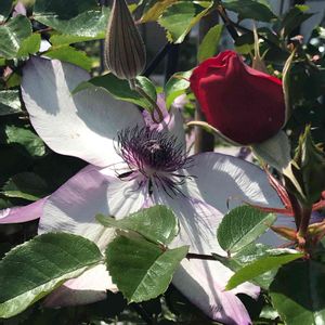 大きなヒトデみたいなクレマチス に話しかけているバラ フロレンティナ