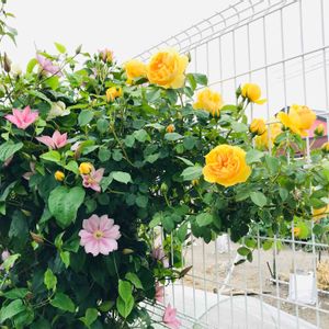 つるバラグラハムトーマスとフランボワーズバニーユ、クレマチス キャロラインのコラボが叶いました。