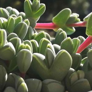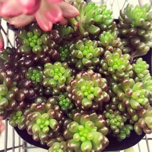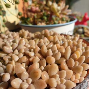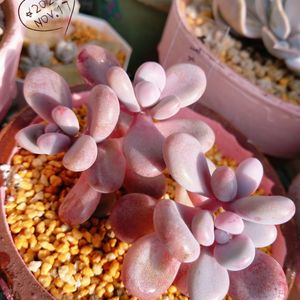 丸っこいフォルムが特徴のアメチスチヌム×メキシコポルデンシス。葉の内側も紅葉した外側も柔らかい色で癒やされる。