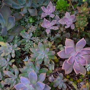 南側花壇の地植え多肉ちゃん達😻💗🤍💚💜 左上の巨大エケ・ダスティさんがめっちゃ増えて 各花壇を占拠し始めました😸💧(北側でも増えてます💧💧) 群生させたら大迫力だろうけど もう場所が無い…👀❇️