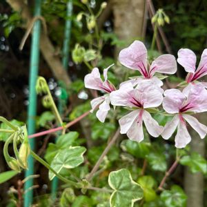 💚🩷アイビーゼラニウム♪ エレガンテ♪🩷💚 雨降りを楽しんでる様に咲いています✨✨✨🥰🎶 寒い時季、どんなお花が咲くかも知らず、肉厚でピンク色の縁取りの葉っぱに惹かれ、お迎えして4年目。毎年可愛らしいお花が咲きます🎶 暖かくなると、葉っぱのピンク色が無くなるのが不思議です🤔 追肥をしたからでしょうか、今年は新芽がスクスク蕾も沢山出て来ました🤗🎶 🏷️乙女色クラブ 🏷️つぼみに魅せられて に参加させてください