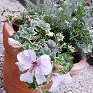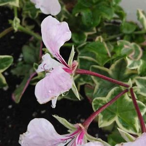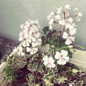 アイビーゼラニウム エレガンテ。 白にピンクのラインが入る花も可憐ですが 真っ白な若葉や、白やピンクの斑入りの葉が アイビーみたいに枝垂れる様子がとても可愛い。 我が庭に数種あるゼラニウムは 全て見切り品コーナーで出会った株たちです。 元気モリモリの優良株ですら短命に終わらせていた数年前までの自分を顧みず連れ帰ってきてしまいました。 そんなわたしの心意気(?)に同情してくれたのか ゼラニウムたちはみんな見事に復活。 ありがたいことです…。