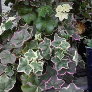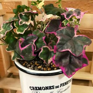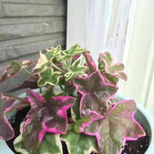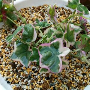 アイビーゼラニウム エレガンテ。 よく見ると葉っぱが2種類あるようで混じってるのもあり3種類の葉が出てます。斑入りの葉っぱは尖っててツヤ無しで斑入りじゃ無い方は葉先が丸くツヤがある。混じってる葉っぱもちゃんとその特徴のまま混じってる😆面白い❗️