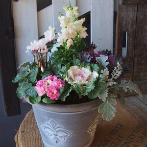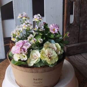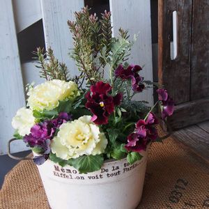 白いブリキポットに! スプレーハボタン、フリル咲きパンジーの寄せ植え #Garden#gardening #flower #ガーデン#ガーデニング#寄せ植え#花の寄せ植え#コンテナガーデン#花と緑のある暮らし #癒やし#ハボタン #メルカリ#リース #humminggarden