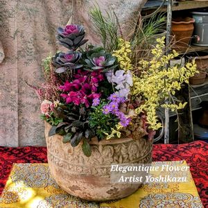 GSユーザーから花鉢植え作家に。伝説の🕯️です✨ 新年あけましておめでとうございます🎍今年もよろしくお願いします🙇 正に新年正月に相応しい作品✨ 「プリペットのイエロー葉を魅せたい 6連葉牡丹,シクラメン,絵になるスミレ·パルム をメインに 13種花鉢植え」(目標:11〜4月 約半年) 気品ばかりでなく風格まで漂い、存在感を醸し出す寄植えなんて見た事ありますか!? 美しくあるうえで最重要は「鉢も含めた全体の調和=構成する苗全体のバランスの美しさを 数ヶ月·長期に渡り保つこと」 6連ハボタンの傘の下に、なんと シクラメン& 絵になるスミレ·パルム を重ねる大胆なチャレンジ✨ 果たしてハボタンで日陰になるスミレは咲き続けるのか → 現在も咲き続けています(11月28日創作) ♦️自由ヶ丘イベント作品展示、次回は3月に開催‼️ 創作後 4ヶ月 の花を、花の最高期に またお魅せできる事を楽しみにしています💖 皆んな来てね〜🤗🫶💞 ❀ ❀ ~ 心を上質にするエレガントでアンティークな花 ~ 根のある生きる花を自在に奏でるアーティスト Elegantique Flower ⚜️ 💐Artist Yoshikazu . ーー・ーー 長くなりますので時間の許す方どうぞ ~ 花鉢植え作家の独り言 ~ 「こうすれば誰でも簡単にそれなりのデザインできますよ動画」「豪勢に盛った寄植えpic」を見せる人ばかり… 花が育つ土台となる鉢内は、土を雑にいれ、肥料パラパラ、ほらねこんなに簡単にできますよ… まるで作った後の維持管理は無いかのよう、曖昧·あやふや…できるだけ触れないように… 話すとしても「表面が乾いたら下から水が滴るまで」「何週間毎に◯◯液肥を…」ありきたりです。 あの~すいません、、、根のある花は生きていて、ずっと咲いているわけでなく、一度散ります。形も当初のままでなく、成長します。 その状態でも美しくあるかどうか… いったいどれ位良い状態を保てるの!? 花は綺麗に咲くの!? 作った後どうしてるの? 育ててるの!? … イベント等で必ず「真似して作ったのに上手く育てられない。どうしたらこんなにバランス良く育てられるのですか!?」質問されます。 私は「育てた花を魅せる」「魅せた後も育てる」をモットーにしています。 そして 「寄植えは 二人称で成立する✨」と考えています 一人称 ”私“ 完結ではなく、二人称 “あなた·相手=根のある生きる花” がいて成立するのです。 「デザインできました」では 一人称=私はできる=自己完結=自己満足、「育て美しさを保つ」相手·あなた=花にとってどうなのか、良い環境を提供できているのかが重要なのです。 根のある花は生きているのですから… . . ♦️今季は ~新たな次元に突入~ 今まで蓄積したデーターから、理想とする土·堆肥·肥料·液肥に出会う事ができ、その配合量·施すタイミングもパーフェクトに近づいてきた感があります。 パーフェクトとは『11月~4or5月まで約半年間「美しい形を保つ」「花が咲く」を保てる』ということです。 育てるさえ解ってくれば、後は環境·自然条件に合わせ微調整を繰り返し、創造美を追求し堪能するだけです . . ♦「💐の管理倶楽部」を立ち上げようと考えています‼️ 育てるができるようになると、断然💐寄植えが楽しくなりますよ☺️ 「私が使って効果を実感した 土·堆肥·肥料·液肥等を紹介·提供し、更に維持管理まで教授する」というスペシャルサービスです✨ .