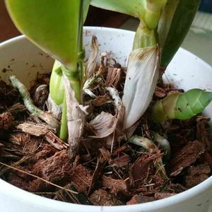 お早うございます。 カトレアの花もそろそろ萎んで来たので終わりにしようと思って見ると、新芽が出て来てました。 又、元に戻しました。