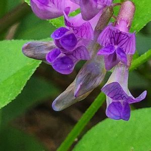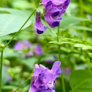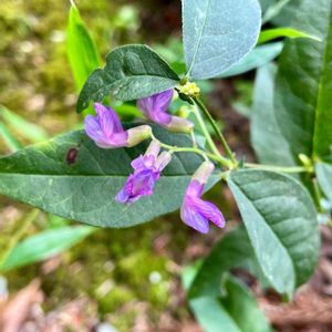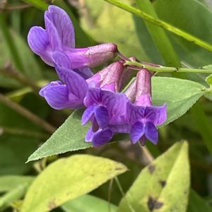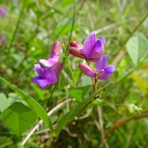 ナンテンハギ(南天萩) マメ科ソラマメ属 雨があがった(土曜日)ので🏃 雑木林の南側縁の膝たけほどの草の中に生えています。 そろそろかな? 刈られちゃったかな😱? と行ってみるともう大分咲いていました。 まだ雫が着いている草をかき分け🤳 マメ科なのに葉っぱは対(左右1枚)の2枚なのよねー。 🟣なかなか上手く撮せません😅