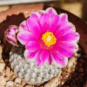 Turbinicarpus valdezianus ツルビニカルプス バラ丸 綺麗なお花が咲きました。 花びらの中心線上に濃いピンクのラインがあり、外にいくにつれ白っぽい色になっています。 昼過ぎに最も花開いて、夕方には閉じ始めるので、タイミングが合わないと開花を見れません。 最初に咲き始めた花は徐々に勢いが落ちてきてますが、蕾があと2つあるのでまだまだ楽しめそうです。
