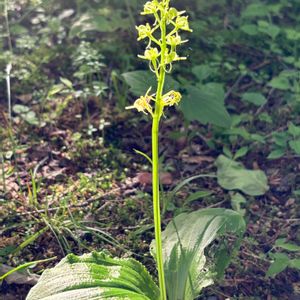 今日の一枚 野山に自然に咲く花 💚クモキリソウ💚 淡緑色の花が穂状に付く花 葉は1株に2枚 西榛名の広い庭のおみやげ 撮影 2025 6 21